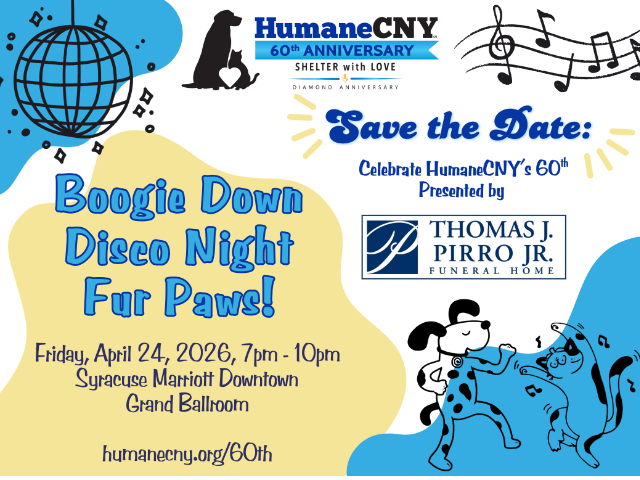 (All day) ![]() HumaneCNY's Boogie Down Disco Night Fur PawsCelebrate HumaneCNY's 60th Anniversary at Boogie Down Disco Night Fur Paws, presented by Thomas J. Pirro Jr. Funeral Home! April 24, 2026, from 7pm - 10pm in the Grand Ballroom at the Syracuse Marriott Downtown. Please note that attendees must be 21+ to enter this event. Head to humanecny.org/60th to purchase your tickets! Help us celebrate with an evening full of food, drinks, raffles, and disco dancing with music from the iconic PopShow Band! Your best Disco-Themed outfit is encouraged but not required.