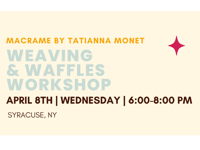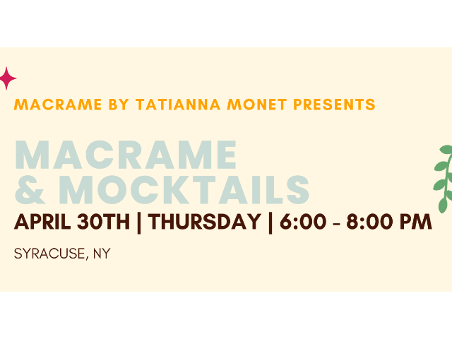 6:00 PM ![]() Macrame and MocktailsIn this hands-on workshop, you will learn basic macrame principles and techniques as well as create your very own one-of-a-kind plant hanger to take home. All this while enjoying complimentary snacks and mocktails.Macrame instruction and all materials are included.April 30, 2026 @ 6PM Location: Pink Rock Co-op | 201 E Jefferson St, Syracuse, NY 13202Event tickets are not refundable but are transferable. Please send me an email if someone else is going in your place.Tickets are only available online at tatiannamonet.comSeating is limited, so register early!