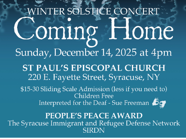 4:00 PM ![]() Winter Solstice Concert: Coming HomeJoin us as we celebrate 40 years of singing for peace and social justice with our Winter Solstice concert, Coming Home. The evening will feature songs of resistance, hope, community, and renewal. Many are familiar favorites from years past performed by our adult, teen, and children’s choirs. This year’s Winter Solstice concert, Coming Home, is both a reflection and a renewal honoring the voices and moments that brought us here, and looking ahead to the next 40 years of community, courage, justice, and music. We’ll gather in song, memory, and hope, continuing our cherished tradition of the annual quilt giveaway and presenting the People’s Peace Award to the Syracuse Immigrant and Refugee Defense Network (SIRDN) through the Workers’ Center of Central New York.